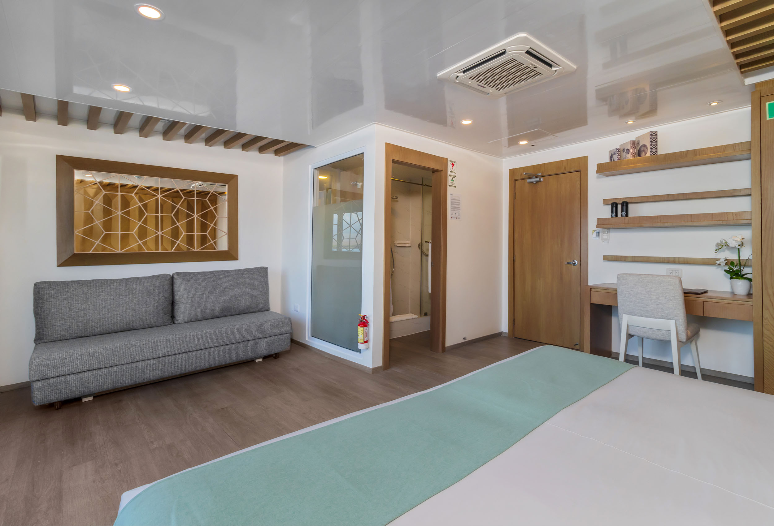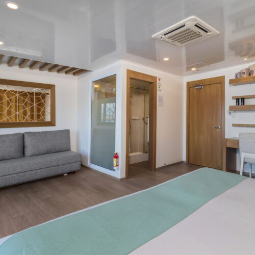 On board the Endemic, the eight Golden Panoramic Suites are airy and comfortable, four of them are located on the main deck and the rest on the upper deck. Each suite has a private balcony; all suites have personalized marine air conditioning control and panoramic views of the islands due to its floor to ceiling/wall to wall glass doors instead of walls toward the outside. Private bathroom, hot and cold water and amenities.